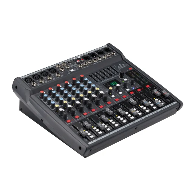 AlcheMix mixer series has been designed to meet the requests of musicians and entertainment operators who need reliable and professional instruments for live shows, rehearsal rooms, schools, home recording, etc. The architecture of these 2-Bus mixers includes 2 subgroups, 2 AUX sends (one with Pre/Post-Fader selection; one Pre-Fader operation). All channels feature 3-band EQ, MUTE, AFL, Group and main assignments. A 7-band graphic EQ on the main outputs with precision filters, and a 48 kHz / 24-bit Digital Effect complete the set of tools of these mixers. The Digital Effect features 16 of the most used presets (Hall-Room-Plate reverb, Delay-Echo, and allow to customize one parameter through the Tap-Tempo button. The line consists of 4 models: AlcheMix 402FX, 402UFX, 602UFX and 802UFX with 4, 6 and 8 noiseless Mic/Line preamps. The 402-602-802UFX also feature a 2-In/2-Out USB Stereo Sound Card for recording/playback on PC/Mac at up to 96kHz/24-bit.